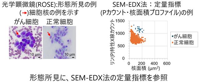 図1 ROSEへの応用を想定し、SEM-EDX法で得た定量指標「Pカウント・核面積プロファイル」(右)と、細胞診画像(左)をセットで参照する例(がん細胞は核が大きく、核内の染色が濃いことが特徴)